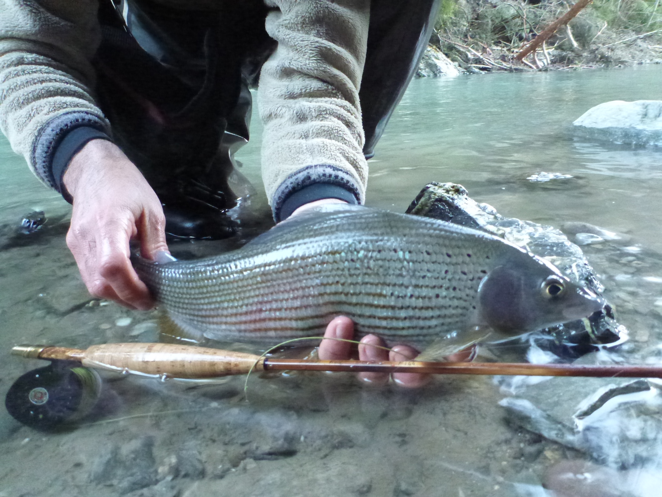 Fin dal mattino pescando sia a secca che a sommersa ci si diverte con trote e temoli in quantità anche se di taglia medio piccola 25-35 cm con qualche eccezione sui 40.